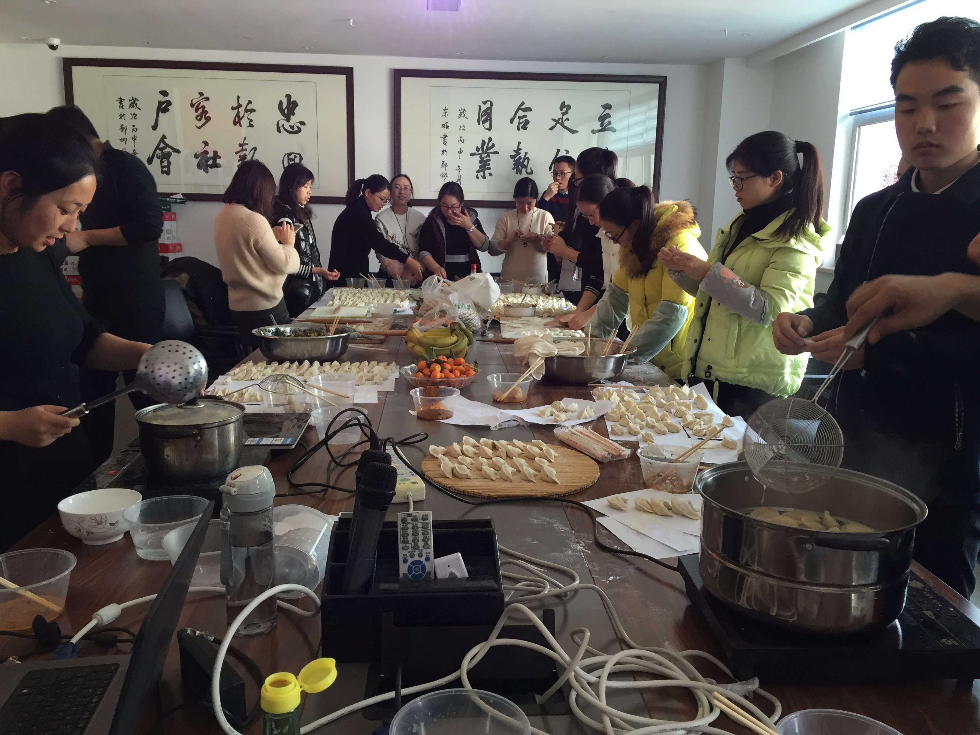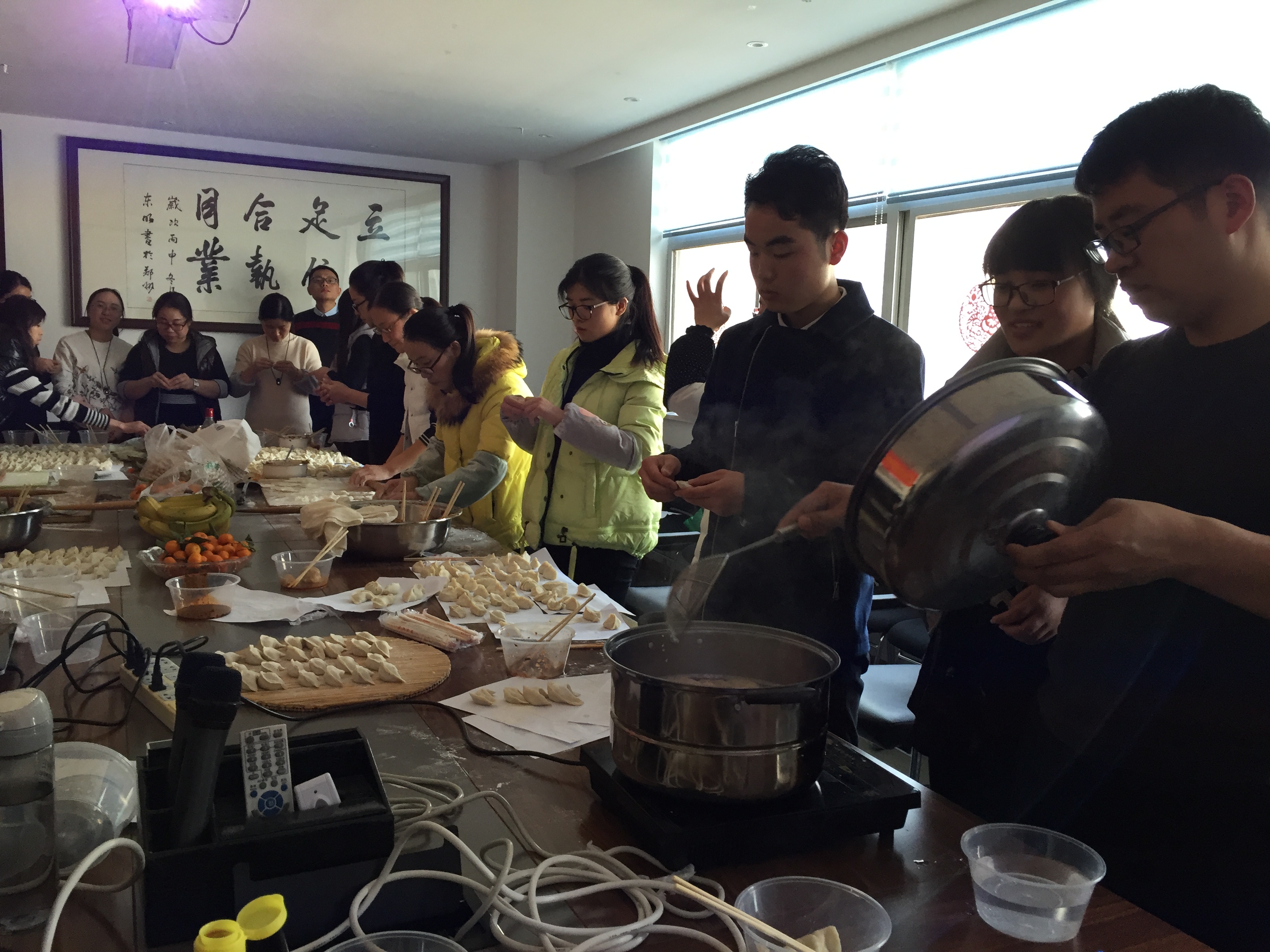 兩個(gè)小時(shí)之后,只見滿滿一桌包好的餃子。這是所有員工齊心協(xié)力的成果,大家的臉上都洋溢著快樂滿足的笑容?!跋嘛溩訃D!”大家伙兒總算可以吃上自己包的餃子了,一鍋又一鍋,香味四溢。大家交談著,玩笑著,吃著玩著,今年的耳朵不會(huì)凍掉了!
