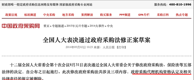 ◆ 2014年8月31日下午,全國人大常委會會議表決通過《政府采購法》修正案,取消政府采購代理機構的資格認定。2014年9月26日財政部印發(fā)了《關于做好政府采購代理機構資格認定行政許可取消后相關政策銜接工作的通知》(財庫〔2014〕122號)。