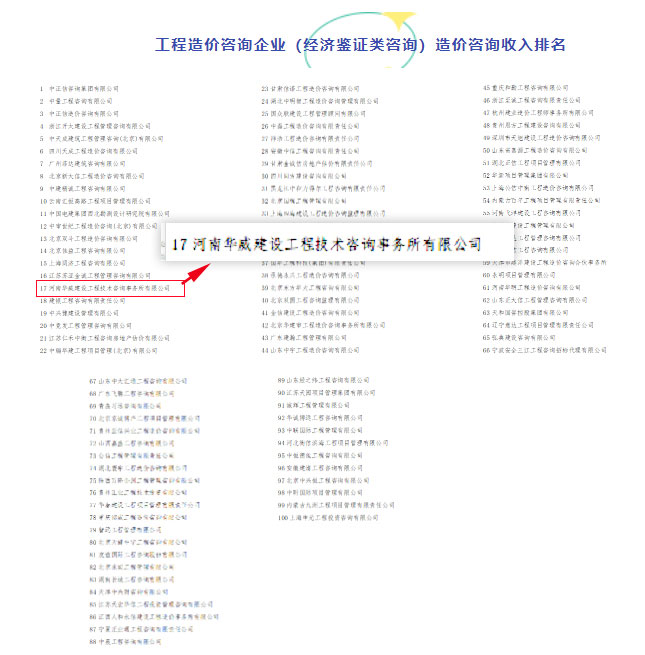 河南華威公司位列2020工程造價咨詢企業(yè)造價咨詢收入第17名!連續(xù)兩年入圍全國百強(qiáng)排名前20名。
