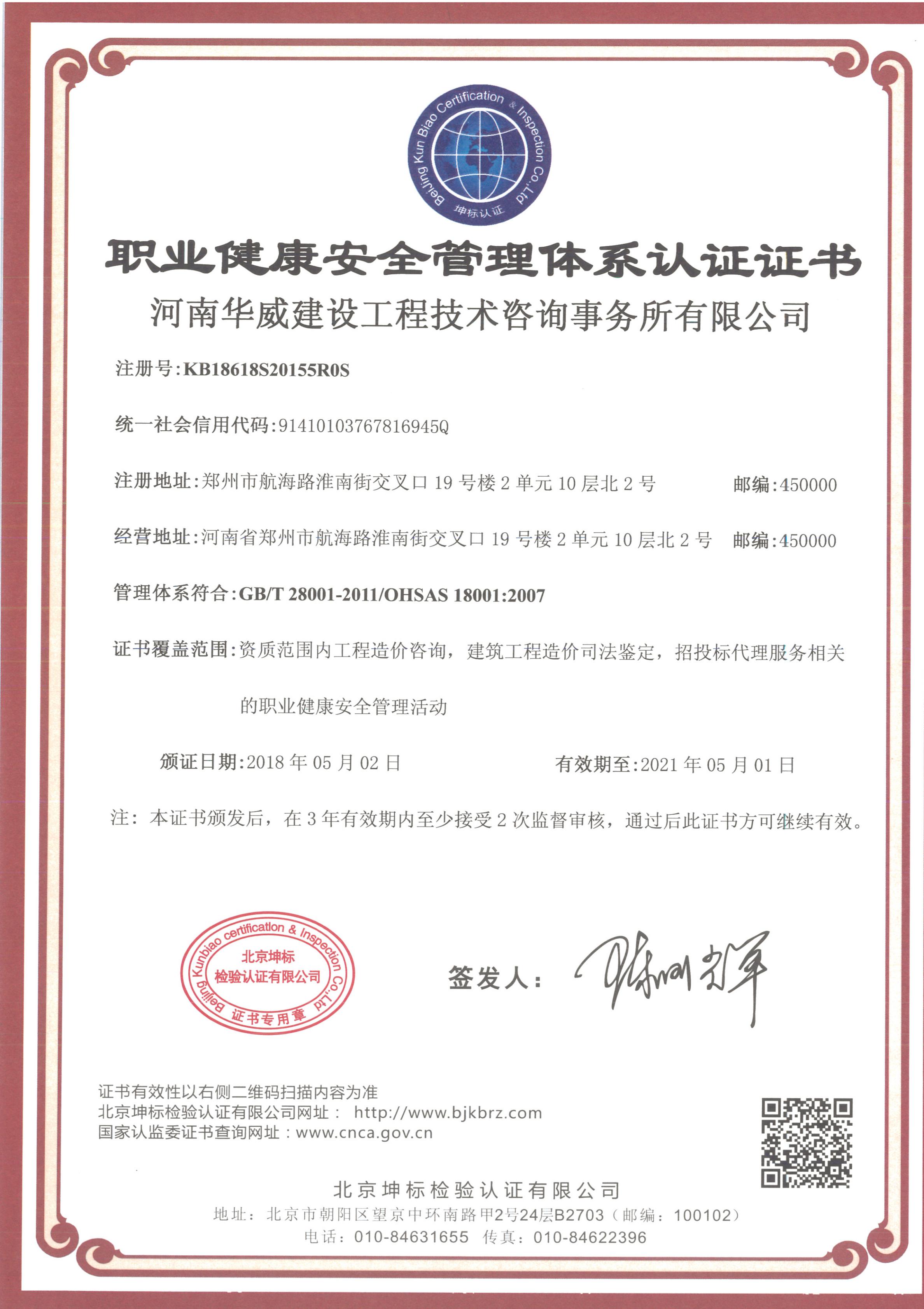 職業(yè)健康安全管理體系認(rèn)證證書(shū)